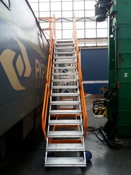 Die Treppen passen sich der Höhe der Arbeitsbühne an und nivellieren sich selbst. Die geringe Neigung der Treppe ermöglicht den bequemen Auf- und Abstieg – auch mit dem Rücken zur Treppe bei einer Treppenneigung unter 45 Grad.