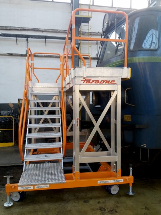 Die Räder der Arbeitsbühne können mit 2 oder 3 Rollen ausgestattet werden, die „Herunterfallen“ und Einklemmen in den Spalt zwischen der Schiene und dem Boden verhindern. Die Arbeitsbühne kann mit Transportgriffen ausgestattet werden, die den Transport von der Plattform mit einem Laufkran zwischen den Gleisen ermöglichen.