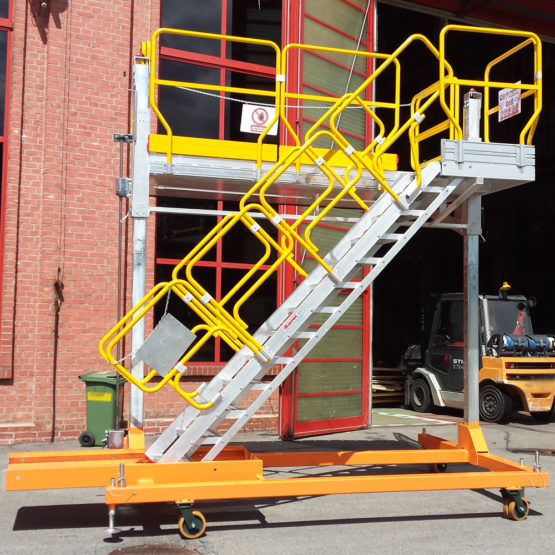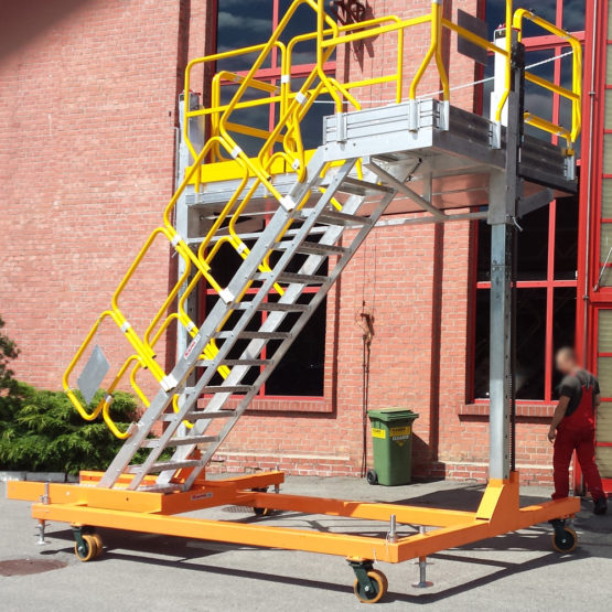 Die mobile Arbeitsbühne mit Höhenverstellung und Barrieren für die Wartung der Dächer von Bussen.