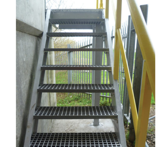 z profilami z GRP tworząc ciągi schodowe lub wejścia na podesty. Stopnie dostępne są również w wersji z żółtą krawędzią, która